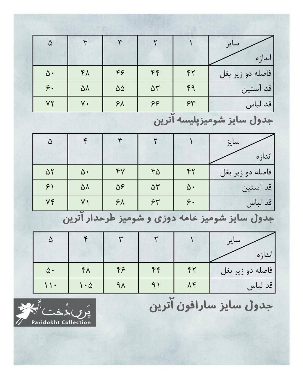 (برای اندازه گیری فاصله دو زیربغل را از روی لباسی که مناسبه مثل شومیز یا مانتو اندازه بزنید و با جدول سایز درج شده در تصاویر چک کنید)
