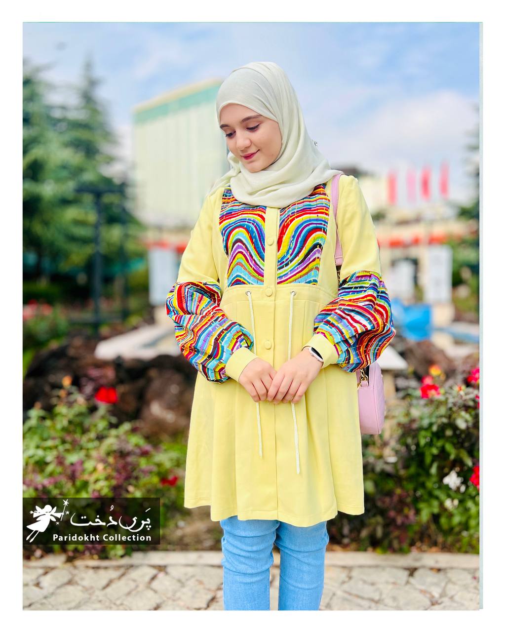 آریسا به معنای رنگین کمان به مانتو کوتاه رنگی رنگی هست. ‎پارچه زمینه‌اش بنفش و لیمویی داره که فوق العاده لطیف و شیکه. خرجکارش هم یه پارچه رنگین کمانی با کوک دوزی هست
