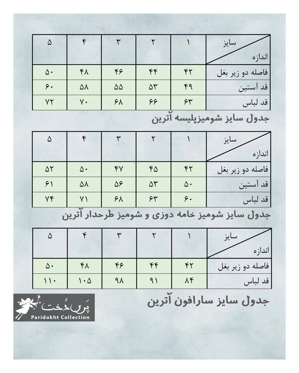(برای اندازه گیری فاصله دو زیربغل را از روی لباسی که مناسبه مثل شومیز یا مانتو اندازه بزنید و با جدول سایز درج شده در تصاویر چک کنید)