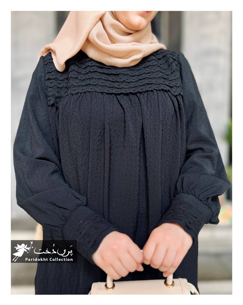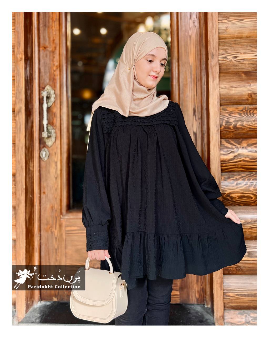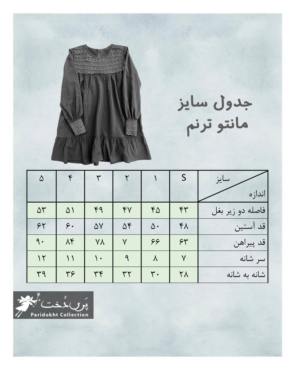 ( یه راهنمایی برای کسانی که اندازه‌ها رو با یه نگاه می‌خوان بدونن. مانکن قدش ۱۶۰هست، سایز ۴ ترنم رو پوشیده)