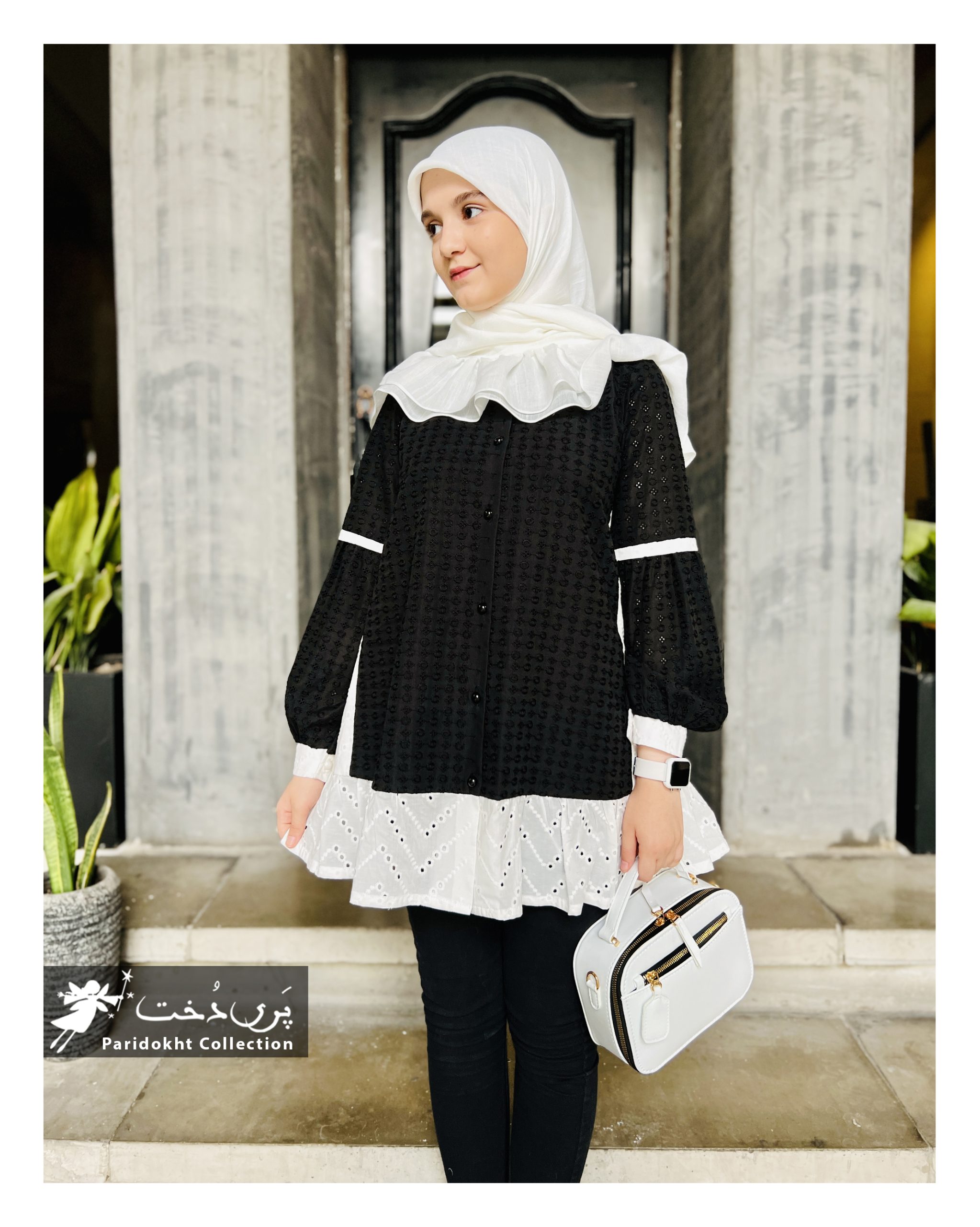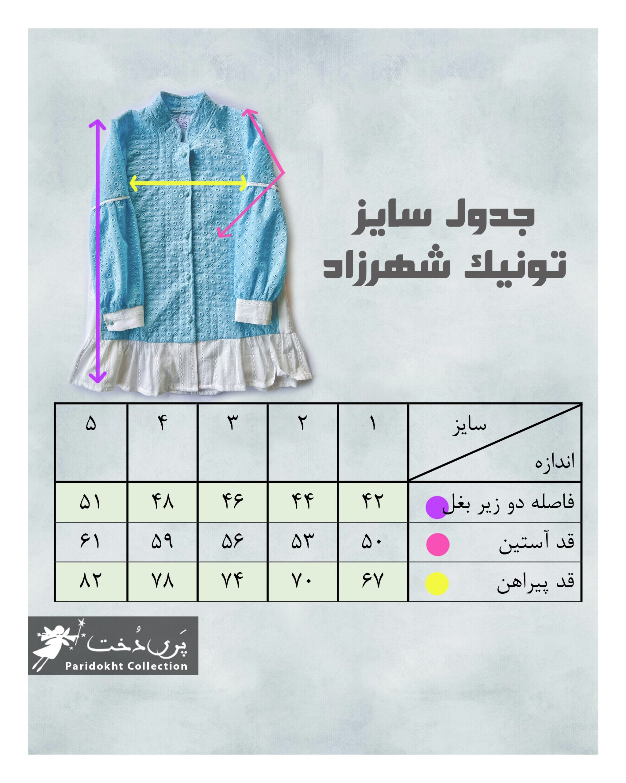 (برای اندازه گیری سایز یک عرض سینه از روی لباسی که مناسبه مثل مانتو یا شومیز بگیرید و با جدول سایز درج شده در عکس ها چک کنید)