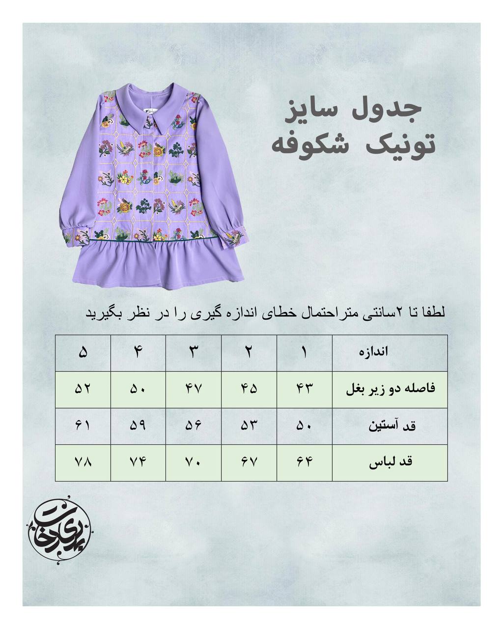 (برای اندازه گیری فاصله دو زیربغل را از روی لباسی که مناسبه مثل شومیز یا مانتو اندازه بزنید و با جدول سایز درج شده در تصاویر چک کنید)