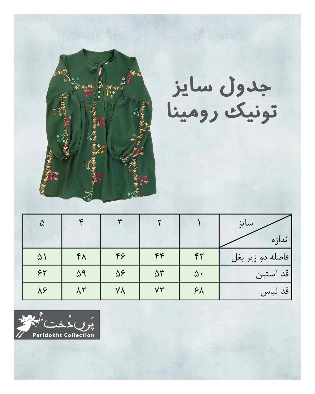 ( یه راهنمایی برای کسانی که اندازهها رو با یه نگاه میخوان بدونن. مانکن قدش ۱۶۰هست، سایز ۴ رومینا رو پوشیده. )