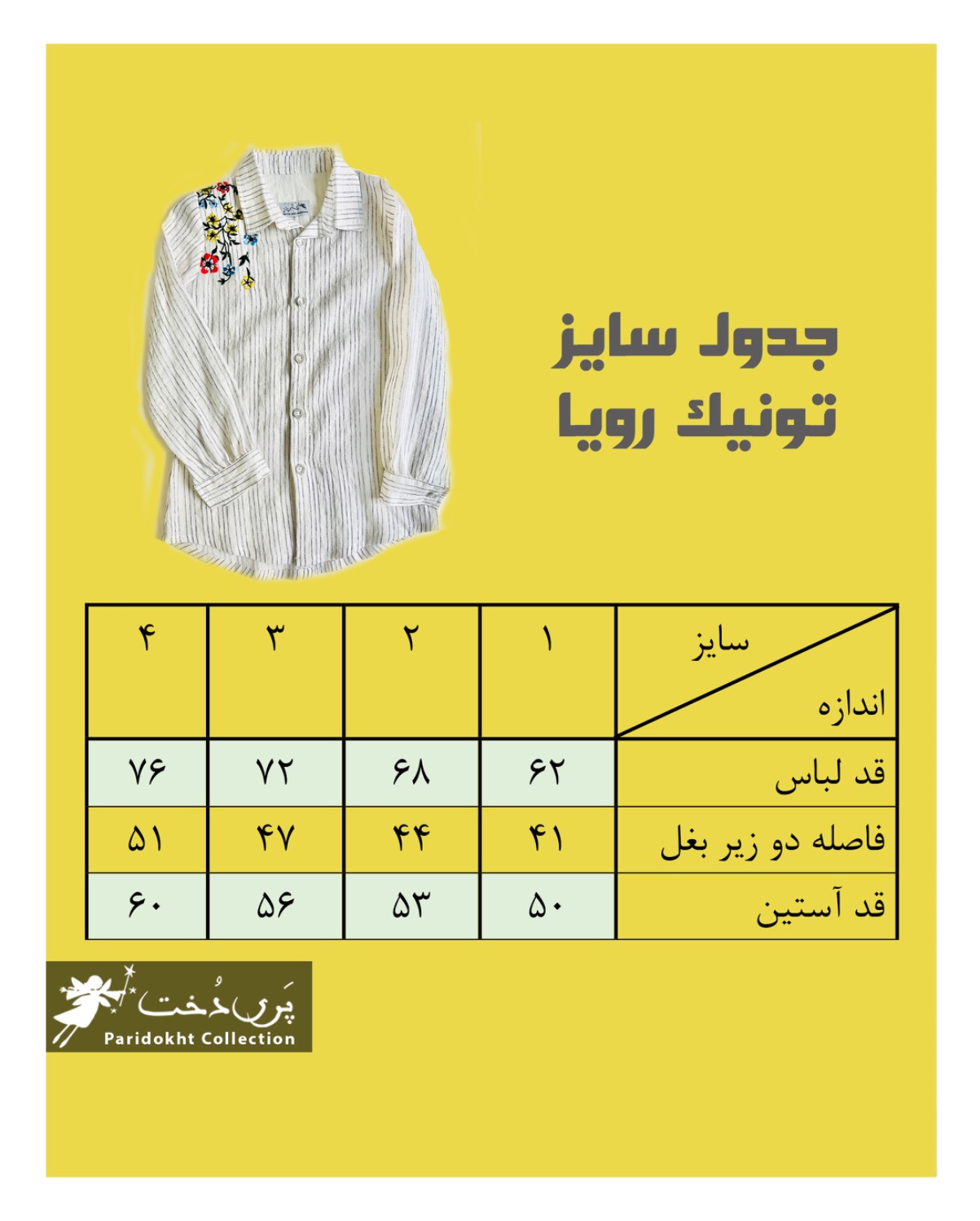 {برای اندازه گیری سایز یک فاصله دو زیر بغل از روی لباسی مانند مانتو یا شومیز که کش نیاید گرفته و با جدول سایزی که در تصاویر درج شده چک کنید}