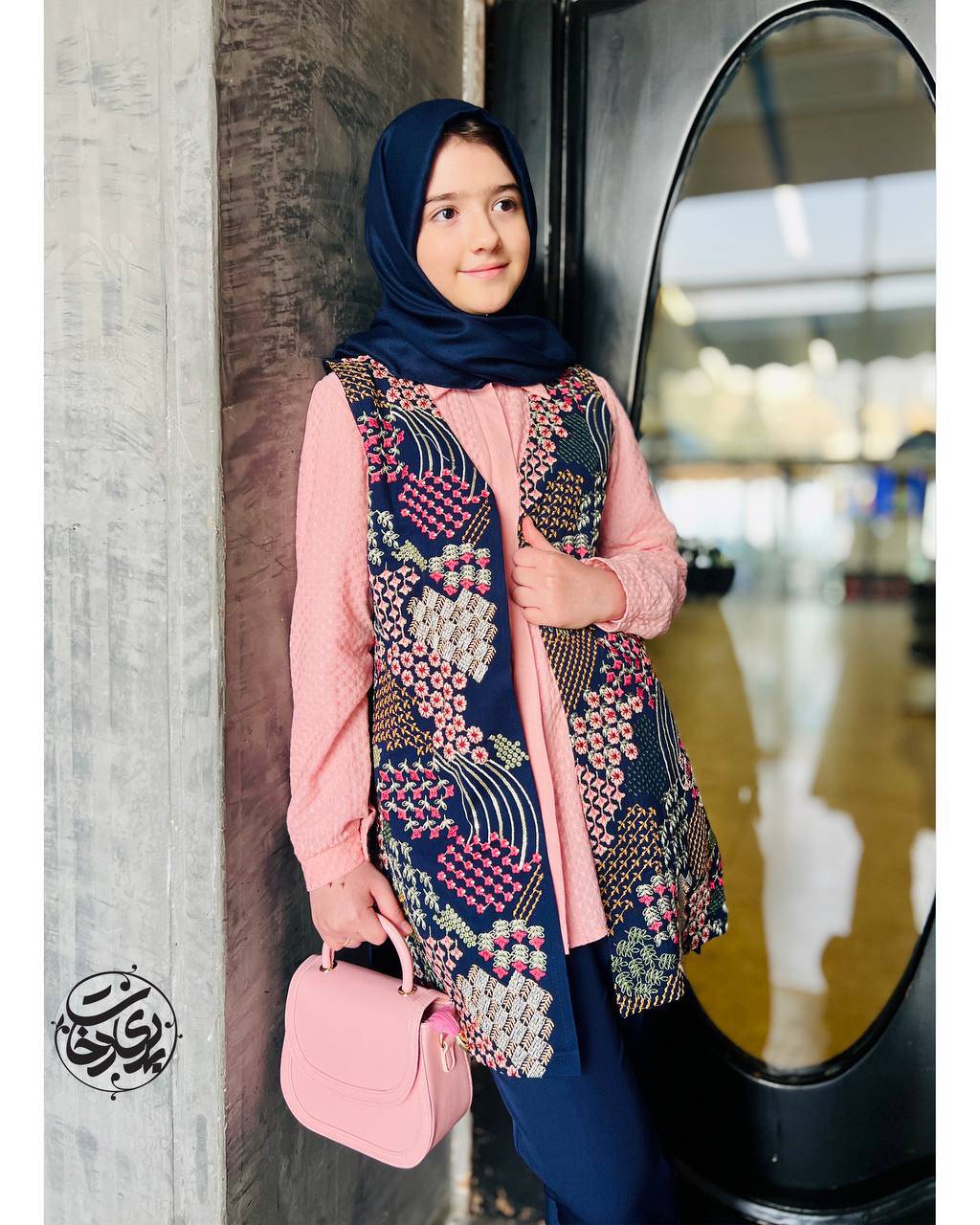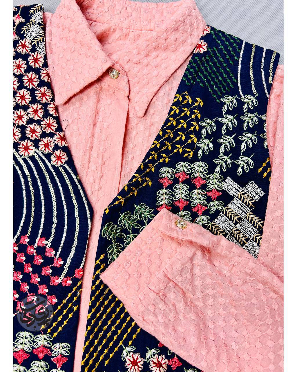 وست رنگ سورمهای هم با تونیک گلبهی هست که از جنس پارچه خامهدوزی و با زمینهای طرحدار ، زیبایی ست رو دو چندان کرده.