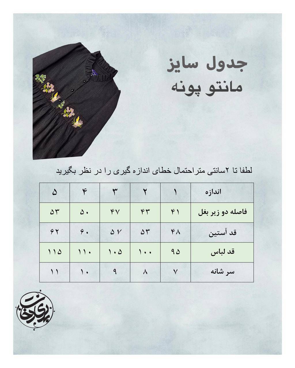 ( یه راهنمایی برای کسانی که اندازه‌ها رو با یه نگاه می‌خوان بدونن. مانکن  قدش ۱۶۰هست، سایز ۴ پونه رو پوشیده. )